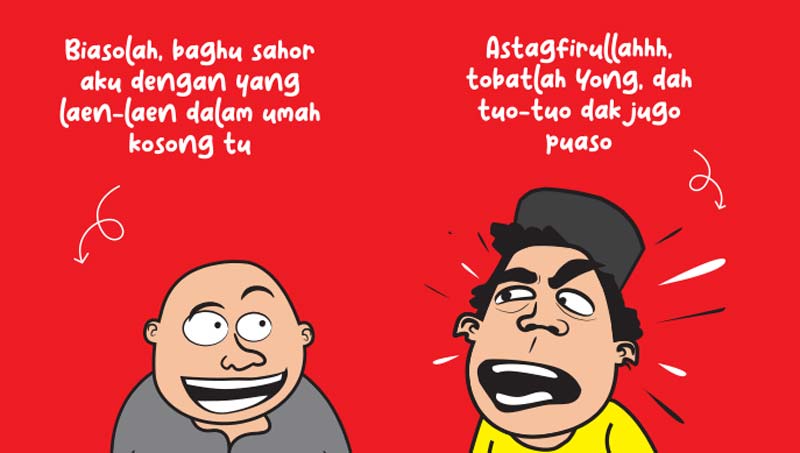 “Biasolah, baghu sahor aku dengan yang laen-laen dalam umah kosong tu,” kato Yon Dul tanpo bedoso. “Astagfirullahhh, tobatlah Yong, dah tuo-tuo dak jugo puaso,” kato Andak Yau. Yong Dol nengo nasehat Andak Yau cumo sengeng ajo.(*)