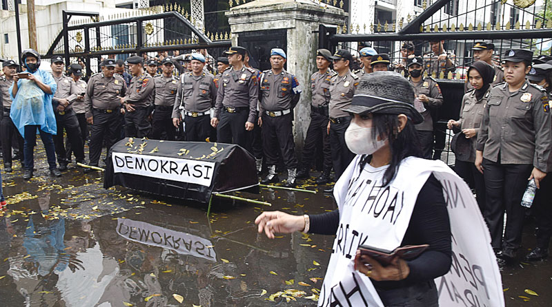 Para pendemo membawa keranda bertuliskan demokrasi di Gedung DPRD Sumatera Utara, Jalan Imam Bonjol, Medan, Selasa (5/3/2024). (Refinaldi Setiawan/Rpg)