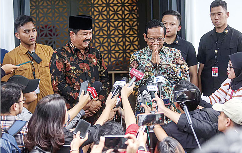 Menko Polhukam Hadi Tjahjanto bersama mantan Menko Polhukam Mahfud MD saat bertemu di Jakarta, beberapa waktu lalu. (MIFTAHUL HAYAT/JAWA POS)