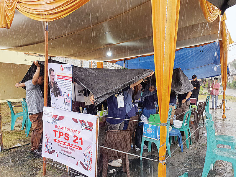 Petugas TPS 21 di Perumahan Indah Perdana Lestari, Kelurahan Sialangmunggu, Kecamatan Tuah Madani, Pekanbaru menggunakan terpal untuk mengamankan kertas suara dari air hujan, Rabu (14/2/2024). Hujan deras di TPS tersebut saat proses pencoblosan berlangsung. (DENNI ANDRIAN/RIAU POS)