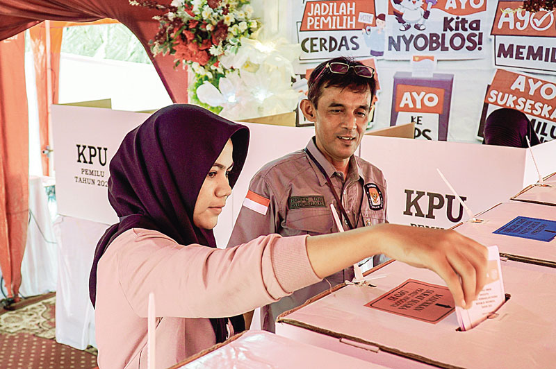 Seorang warga didampingi petugas KPPS memasukkan surat suara Pemilu 2024 ke kotak suara di TPS 106, Kelurahan Sidomulyo Barat, Kecamatan Tuah Madani, Pekanbaru, Rabu (14/2/2024). (DEFIZAL / Riau Pos)
