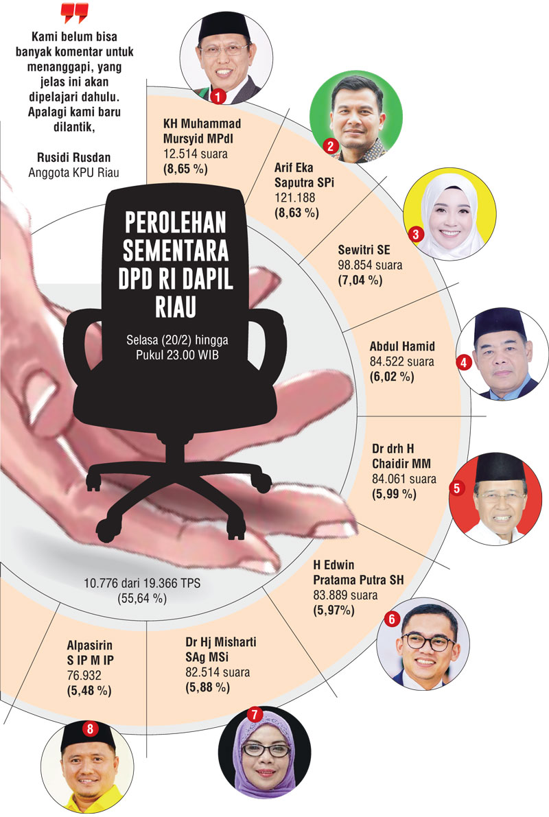 ‘’Suara rakyat Riau itu jangan sampai dihianati. Kita berpatokan terhadap C1. Jangan dipikir semua calon DPD ini tidak punya C1, kami punya C1. Kita bermitra dengan banyak pihak di setiap kabupaten/kota,” tambahnya.