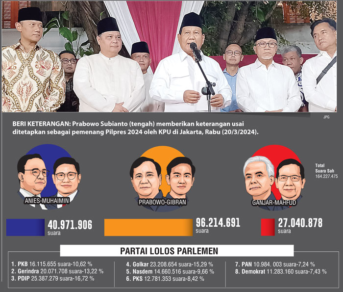 Hasilnya, pasangan calon presiden dan wakil presiden nomor urut 2 Prabowo Subianto-Gibran Rakabuming Raka unggul dan ditetapkan sebagai pemenang Pemilihan Presiden (Pilpres) 2024.