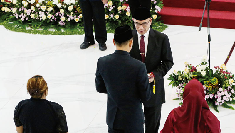 Ketua KPU Hasyim Asy’ari bersama para komisioner lain menyalami para komisioner KPU daerah seusai pelantikan di Kantor KPU, Jakarta, Ahad (24/3/2024). (Salman Toyibi/Jawa Pos)
