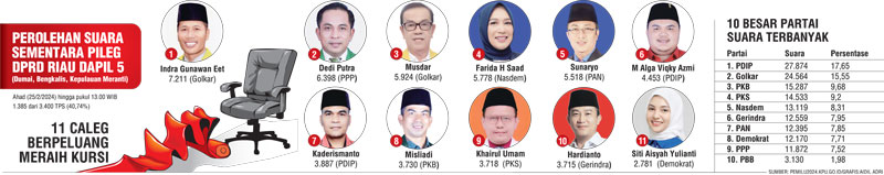 Berdasarkan perolehan suara yang masuk, PDIP dan Partai Golkar berpeluang memperoleh dua kursi DPRD Riau di dapil ini. PDIP berada di puncak dengan 27.874 (17,65) persen suara. Golkar berada di posisi kedua dengan raihan 24.564 (15,55 persen).
