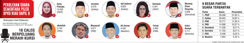 PEKANBARU (RIAUPOS.CO) – Partai Demokrasi Indonesia Perjuangan (PDIP) memimpin sementara perolehan suara Pemilihan Legislatif (Pileg) DPRD Riau Daerah Pemilihan (Dapil) 6 mencakup wilayah Kabupaten Siak-Pelalawan. Tak hanya itu, Calon Legislatif (Caleg) PDIP Sella Pitaloka juga meraih suara terbanyak sementara.