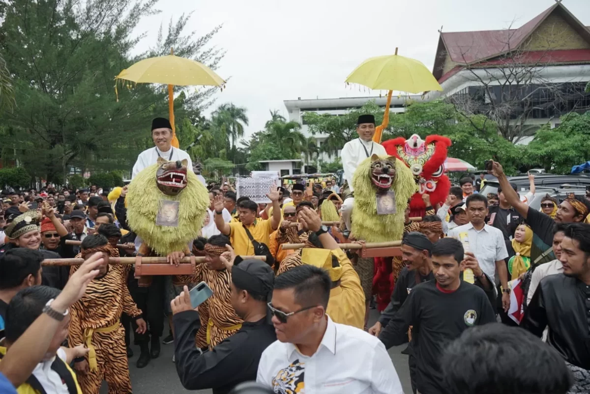 Pasangan Syamsuar dan Mawardi (Suwai) saat diarak simpatisan menuju gedung KPU Riau, Selasa (27/8/2024). (EVAN GUNANZAR/RIAU POS.CO)