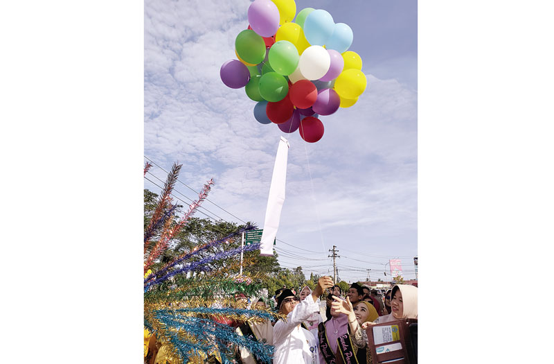 Bunda PAUD Kota Dumai Leni Ramaini, melepaskan balon sebagai tanda karnaval Hardiknas PAUD dimulai, Rabu (28/2/2024). (SYAHRI RAMLAN/RIAU POS )