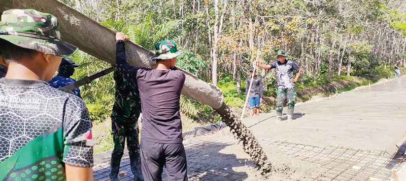 PENGECORAN JALAN: Personel TNI menunggal bersama warga melakukan pengecoran Jalan Dewi Sri di Kampung Sungai Tengah, Kecamatan Sabak Auh, Kabupaten Siak, Sabtu (2/3/2024). (KODIM SIAK UNTUK RIAU POS)