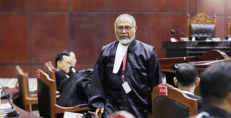 Kuasa Hukum Paslon Nomor Urut 1, Bambang Widjojanto berjalan keluar dari sidang saat Eddy Hiariej memberikan keterangan sebagai ahli pihak paslon nomor urut 2 dalam sidang PHPU di Mahkamah Konstitusi, Jakarta, Kamis (4/4/2024). (FEDRIK TARIGAN/ JPG)