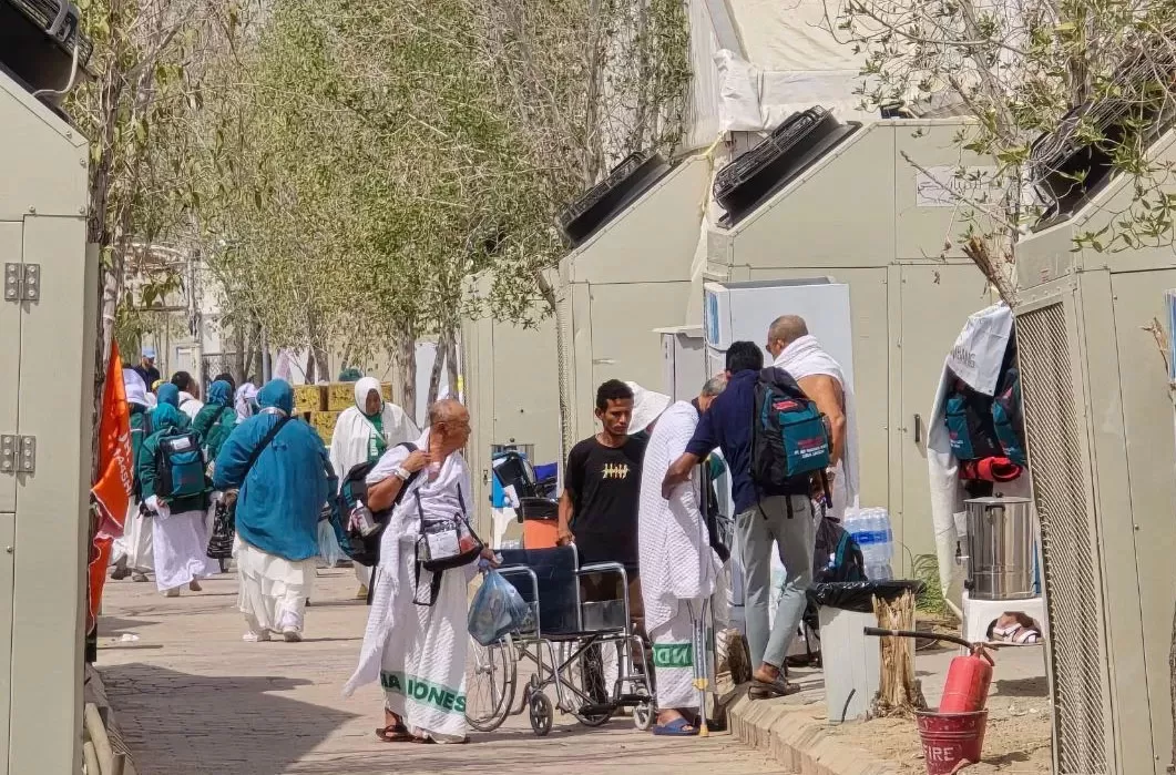 Para jemaah haji Indonesia mulai tiba di tenda tempat mereka tinggal di Arafah. Mereka akan menjalankan ibadah wukuf pada Sabtu (15/6/2024) waktu Arab Saudi. (Aris Imam/Jawa Pos)