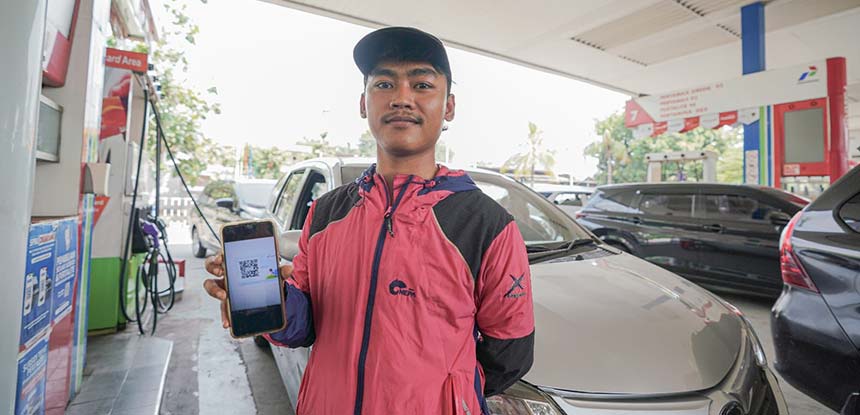 Pembeli Pertalite menunjukkan barcode program subsidi tepat Pertamina. (PERTAMINA UNTUK RIAU POS )