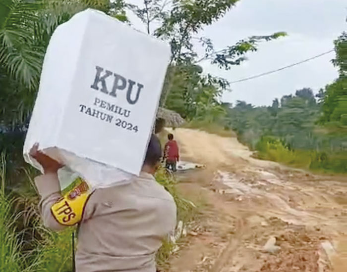 TENAYAN RAYA (RIAUPOS.CO) – Beredar sejumlah foto dan video beberapa petugas pelaksana pemilihan umum (pemilu) dan polisi memikul logistik pemilu. Sambil membawa kardus-kardus itu, mata mereka terfokus ke jalan yang mereka lewati.