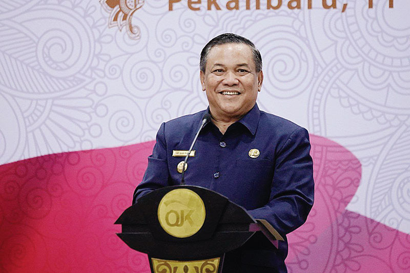 Pj Gubernur Riau SF Hariyanto memberikan kata sambutan pada kegiatan OJK, beberapa waktu lalu.(DISKOMINFOTIK RIAU UNTUK RIAU POS)