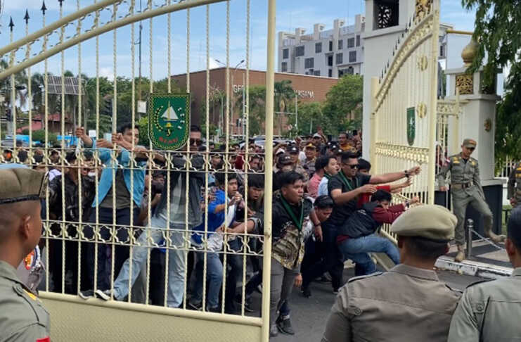 PEKANBARU (RIAUPOS.CO) — Aksi demonstrasi puluhan massa yang tergabung dalam Aliansi Masyarakat Riau Peduli Keadilan di depan Kantor Gubernur Riau, Jalan Jenderal Sudirman, Pekanbaru, Senin (13/10), berujung ricuh. Massa yang awalnya berorasi tertib, tiba-tiba mendorong pagar depan kantor gubernur hingga jebol setelah permintaan mereka untuk bertemu langsung dengan Gubernur Riau Abdul Wahid tidak ditanggapi.