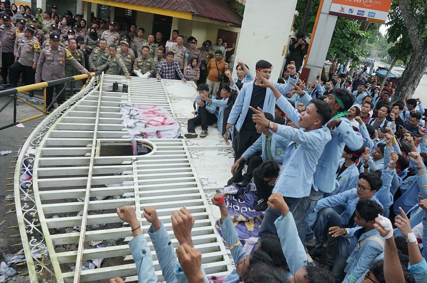Ratusan Mahasiswa dari Badan Eksekutif Mahasiswa (BEM) Universitas Riau (Unri) merubuhkan pagar saat aksi unjuk rasa di Gerbang Kantor Gubernur Riau, Kamis (14/8/2025). ft : EVAN GUNANZAR/RIAU POS