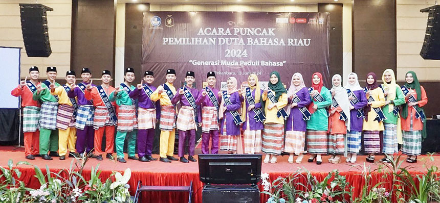 Para finalis Duta Bahasa 2024 foto bersama setelah acara pemilihan di Pekanbaru, Kamis (13/6/2024). (BALAI BAHASA PROVINSI RIAU UNTU RIAU POS)