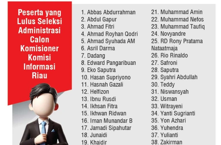 PEKANBARU (RIAUPOS.CO) – Tim seleksi calon anggota Komisi Informasi (KI) Provinsi Riau periode 2026–2029 mengumumkan sebanyak 38 peserta dinyatakan lulus seleksi administrasi.