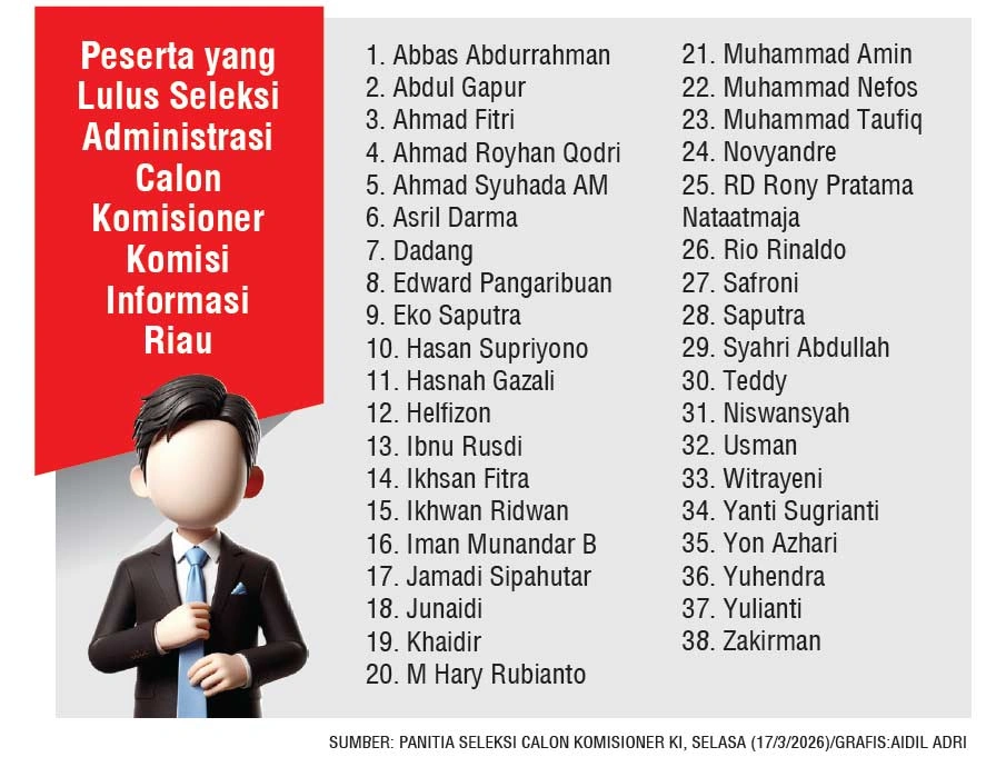 PEKANBARU (RIAUPOS.CO) – Tim seleksi calon anggota Komisi Informasi (KI) Provinsi Riau periode 2026–2029 mengumumkan sebanyak 38 peserta dinyatakan lulus seleksi administrasi.