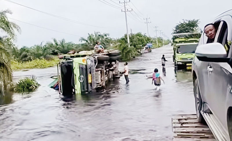 Salah satu truk terguling di Jalan Lintas Timur Sumatera, Desa Kemang, Kecamatan Pangkalan Kuras, Kabupaten Pelalawan, Jumat (19/1/2024). Banjir di jalan ini mulai surut dan sudah bisa dilewati kendaraan roda enam. (FACEBOOK USTAZ ABDUL SOMAD)