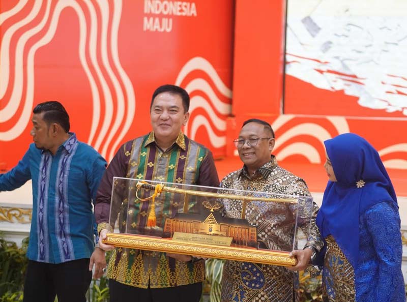 Pj Gubri Rahman Hadi menerima kenang-kenangan dari Kapolda Riau Irjen Pol Mohammad Iqbal, Selasa (18/2/2025) malam.