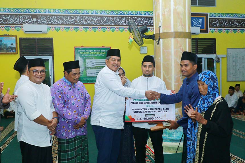 Bupati Siak Alfedri disaksikan Pimpinan Cabang BRK Syariah Jon Hendri menyerahkan CSR dalam safari Ramadan yang digelar di Masjid Amarullah, Kampung Laksamana, Kecamatan Sabak Auh,