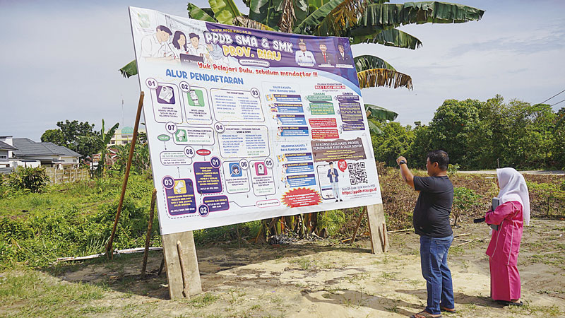 Warga melihat pengumuman persyaratan pendaftaran Penerimaan Peserta Didik Baru (PPDB) 2024 di SMAN 19, Jalan Garuda, Kecamatan Binawidya, Kelurahan Tobek Godang, Pekanbaru, Jumat (21/6/2024). (EVAN GUNANZAR/RIAU POS)