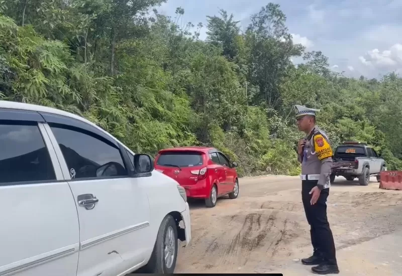 Kasatlantas Polres Kampar AKP Vino Lestari saat melakukan pengaturan lalu lintas di Jalan Lintas Barat Riau-Sumatera Barat (Sumbar). Tepatnya di Km 106-107 di Kecamatan XIII Koto Kampar. (POLRES KAMPAR UNTUK RIAUPOS.CO)