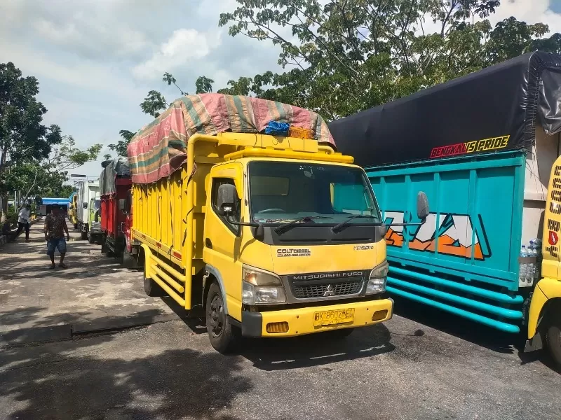 Mobil truk muatan TBS kelapa sawit mengantre selama tiga hari dan menunggu giliran untuk diseberangkan di dermaga Ro-Ro Air Putih Bengkalis, Senin (3/11/2025). (Abu Kasim/Riaupos.co)