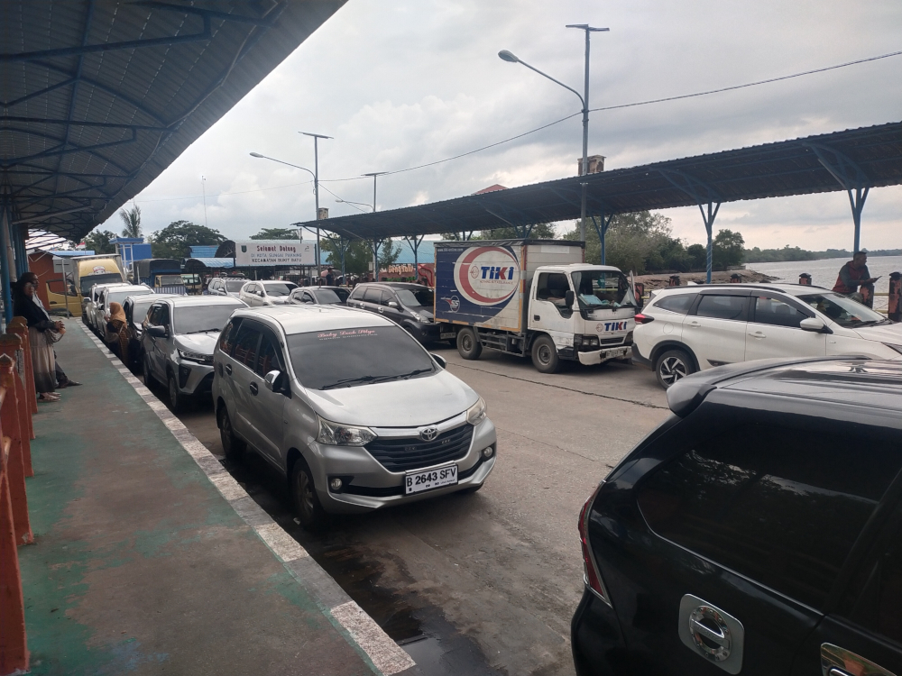 Puluhan mobil terjebak antrean panjang di dermaga Ro-Ro Sungai Selari-Pakning, Bengkalis, ahad (5/10/2025).(Abu Kasim / Riau Pos)