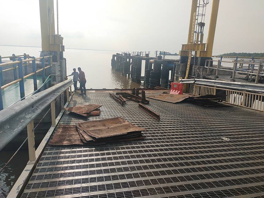 Dari pantauan di lapangan, rekanan kontraktor Dishub Bengkalis sudah memulai pekerjaan membongkar besi MB yang sudah keropos. Sedangkan besi bagian lantai MB serta balok besi bagian bawah juga banyak yang keropos.