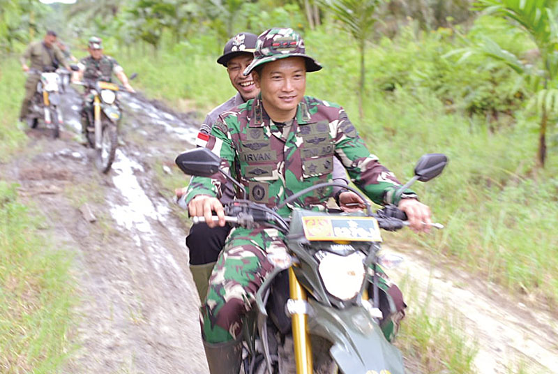 Anggota TNI berboncengan dengan Wakil Bupati Bengkalis Bagus Santoso menaiki sepeda motor, menuju ke lokasi Biotek Mikroba 63 di lahan Pangan TNI di Desa Kesumbu Ampai, Kecamatan Bathin Solapan, Selasa (16/1/2024). (RPG/RIAUPOS.CO)