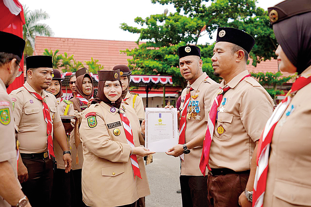 Bupati Bengkalis Kasmarni menyerahkan penghargaan sempena Hari Pramuka di lapangan Kantor Camat Mandau, Selasa (19/8/2025).