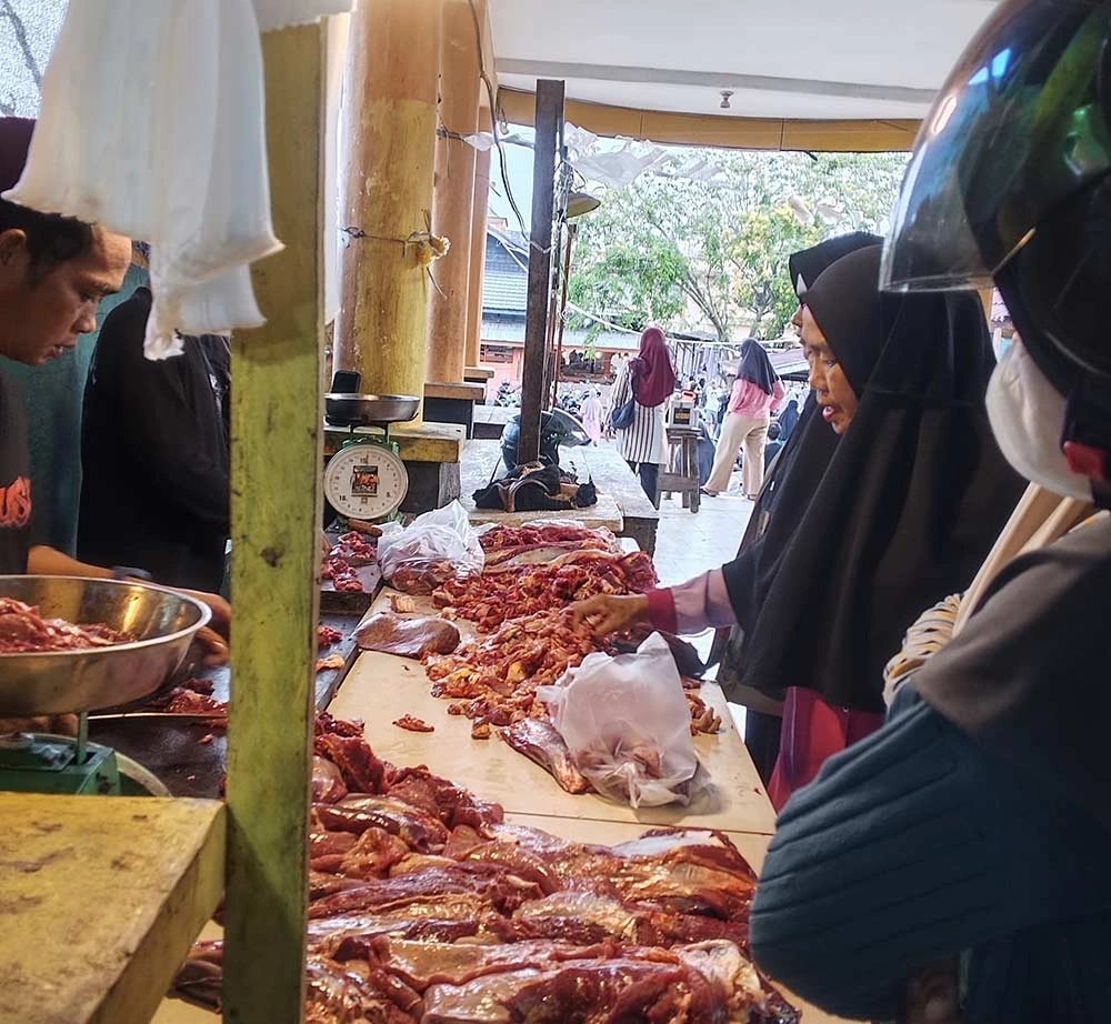 Di lapak daging, meski harga mahal, pembeli tetap ramai. Dina, salah seorang pengunjung, mengatakan daging sapi tetap dibeli untuk menambah selera makan keluarga saat berbuka dan sahur.