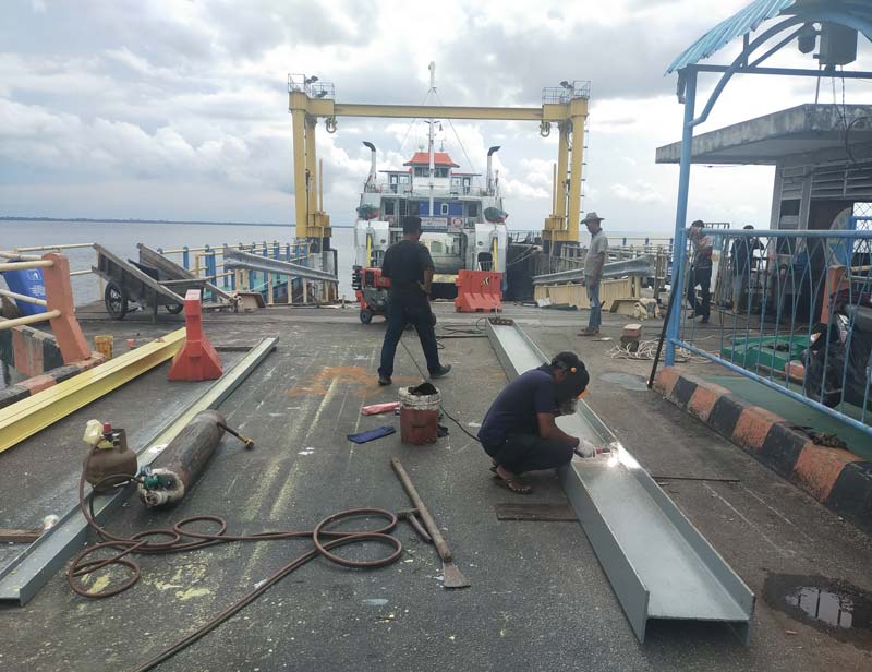 Rekanan kontraktor Dishub Bengkalis sedang melakukan perbaikan ramdoor Ro-Ro di Dermaga Satu Air Putih, Bengkalis, Senin (24/2/2025).