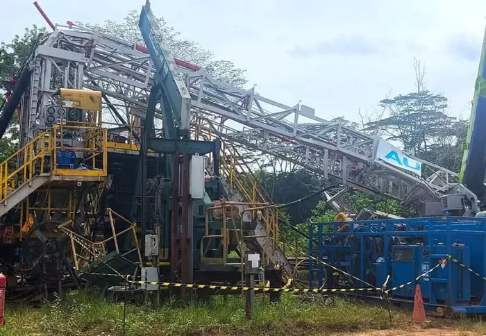“Pada saat joint pertama string 3-1/2 inci drillpipe diangkat, tiang rig (mast rig) tiba-tiba bengkok dan roboh ke arah catwalk,” jelas Andre.