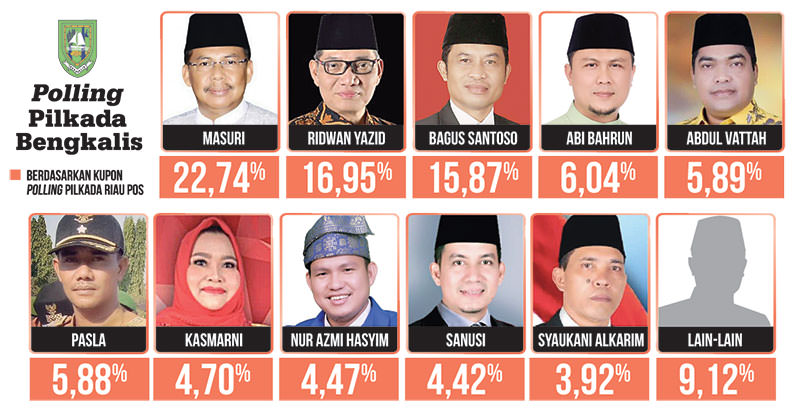 Urutan teratas masih dikuasai Masuri alias Bagong. Ketua Ikatan Jawa Riau (IKJR) Kabupaten Bengkalis dan Ketua Kamar Dagang dan Industri (Kadin) Kabupaten Bengkalis itu mendapatkan dukungan 22,74 persen. Staf Ahli Bupati Bengkalis Bidang Ekonomi, Pembangunan dan Keuangan, H Abdul Ridwan Yazid SSos di peringkat kedua.(nda)