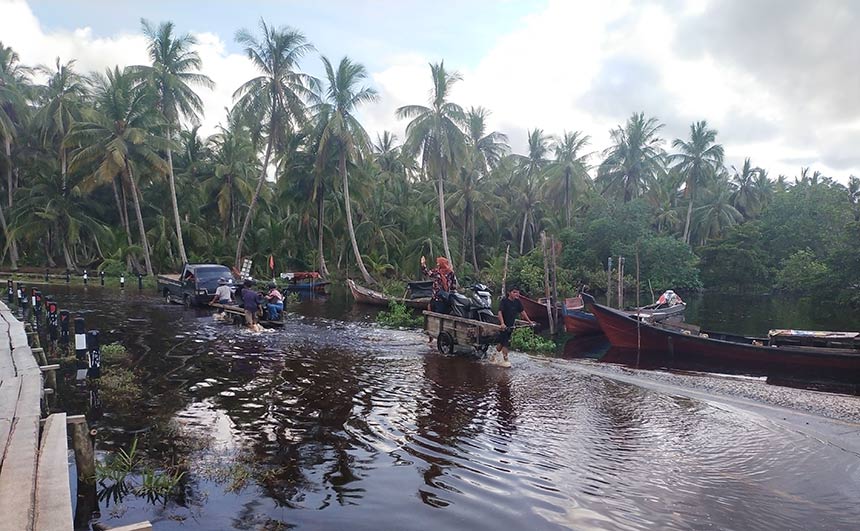 “Sudah empat hari ini banjir air pasang. Hanya sepeda motor yang bisa diangkut pakai gerobak,” ujar Andi, salah seorang pemilik gerobak yang menyeberangkan sepeda motor warga dari arah Teluk Pambang menuju Bengkalis.