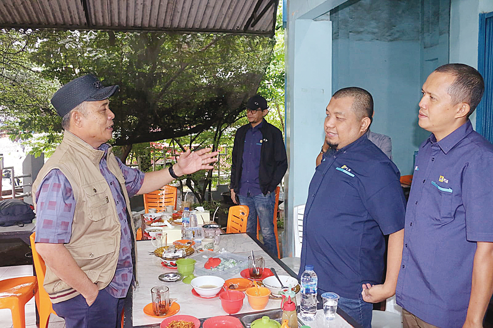 Bupati Inhil Herman berbincang santai setelah menjalin pertemuan dengan Manager PLN UP3 Rengat Tatok Winarko di salah satu tempat sarapan di Kota Tembilahan, Selasa (5/8/2025).