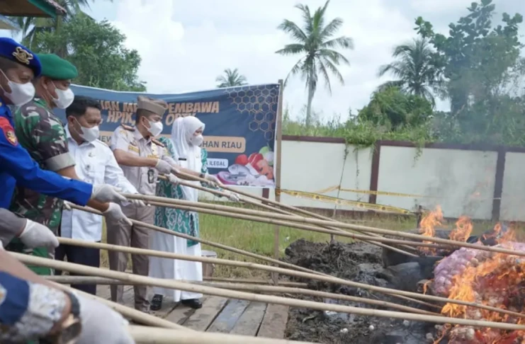 TEMBILAHAN (RIAUPOS.CO) – Sebanyak 48,39 ton komoditas pangan ilegal dimusnahkan dengan cara dibakar di Kabupaten Indragiri Hilir (Inhil), Kamis (16/4), sebagai langkah tegas terhadap peredaran barang tanpa dokumen resmi.