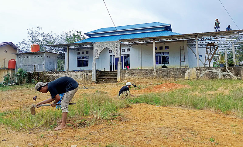 Jemaah TNAJ di Majelis Zikir Darul Falah Desa Kota Lama melakukan bersih-bersih halaman masjid di Kecamatan Rengat Barat, Jumat (8/3/2024). (kasmedi/riaupos.co)