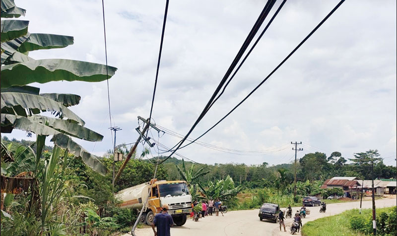 Tiang listrik PLN di Jalan Lintas Timur, Desa Kelesa, Kecamatan Seberida ditabrak truk hingga tumbang dan menyebabkan terhentinya aliran listrik, Ahad (10/3/2024). (PLN UP3 Rengat untuk riaupos.co)