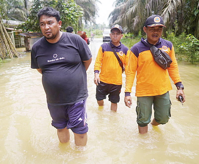 Sejumlah personel KPBD Inhu melakukan patroli jalan kaki di wilayah terdampak banjir, Senin (19/2/2024). Banjir terjadi akibat Sungai Cenaku meluap setelah wilayah daerah itu diguyur hujan. (KPBD Inhu untuk riau pos)