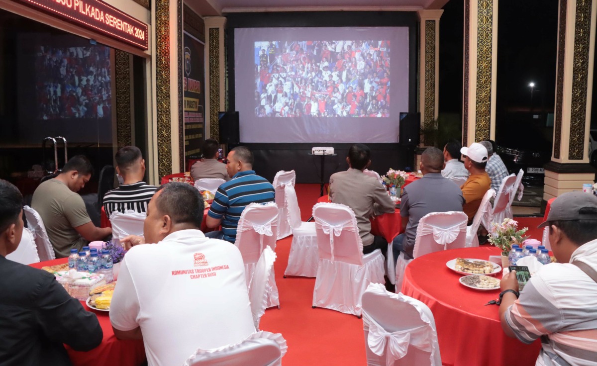 Polres Kampar menggelar nobar sepak bola antara Timnas Indonesia vs China bersama Klub Motor Paguyuban Motor Kampar, Selasa (15/10/24) malam.