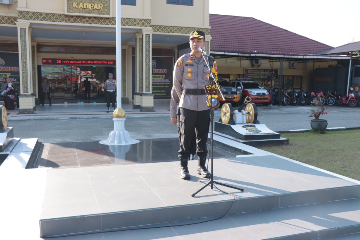 Bertindak sebagai Inspektur Apel Kapolres Kampar AKBP Ronald Sumaja yang diwakili oleh Waka Polres Kampar Kompol Andi Cakra Putra dan sebagai Komandan Apel Ipda Sulthon Sekar Jagat.