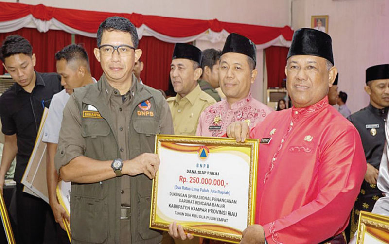 Selanjutnya dilakukan penyerahan dana siap pakai dari BNPB Pusat sebanyak Rp250 juta, sebagai dukungan operasional penanganan darurat bencana banjir untuk Kabupaten Kampar dan kabupaten lainnya di Provinsi Riau yang terdampak banjir.(ade)