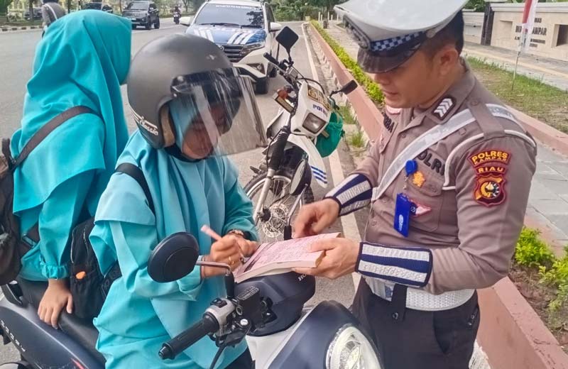 Personel Satlantas Polres Kampar memberikan sanksi tilang kepada pengendara saat Operasi Keselamatan Lancang Kuning 2025, Kamis (19/2/2025).