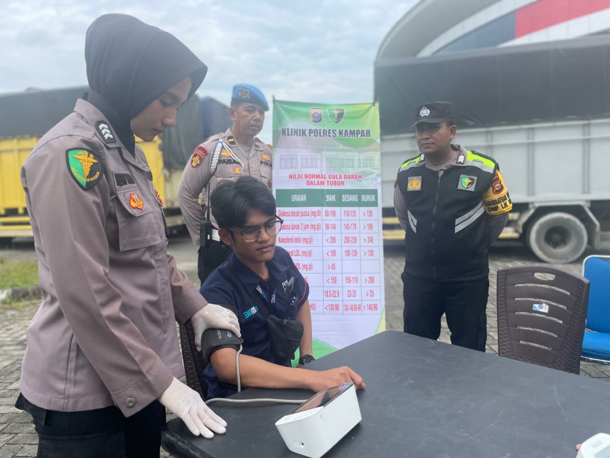 KAMPAR (RIAUPOS.CO) – Demi kelancaran pendistribusian logistik Pilkada 2024 di Kabupaten Kampar, Bidokes Polres Kampar menggelar pemeriksaan kesehatan terhadap para driver truck yang akan bertugas. Kegiatan ini merupakan bagian dari Operasi Mantap Praja Lancang Kuning 2024, yang bertujuan untuk memastikan keamanan dan kelancaran seluruh rangkaian Pilkada.