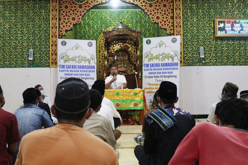Ditemani Kalapas Kelas IIA Bangkinang Sutarno, Kadivpas memberikan materi kultum Safari Ramadan di Masjid At-Taubah, yang mana sudah dipenuhi jemaah yang terdiri dari warga binaan dan petugas Lapas Bangkinang.