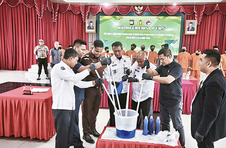Acara tersebut turut dihadiri perwakilan dari Pengadilan Negeri Bangkinang, Kejaksaan Negeri Bangkinang, Lapas Bangkinang Klas IIA, BNK Kampar, serta penasihat hukum. ‘’Dari 16 tersangka yang kami tangkap, ada 11 laporan polisi dengan peran berbeda, mulai dari bandar, pengedar, hingga pemakai,’’ jelas Markus.